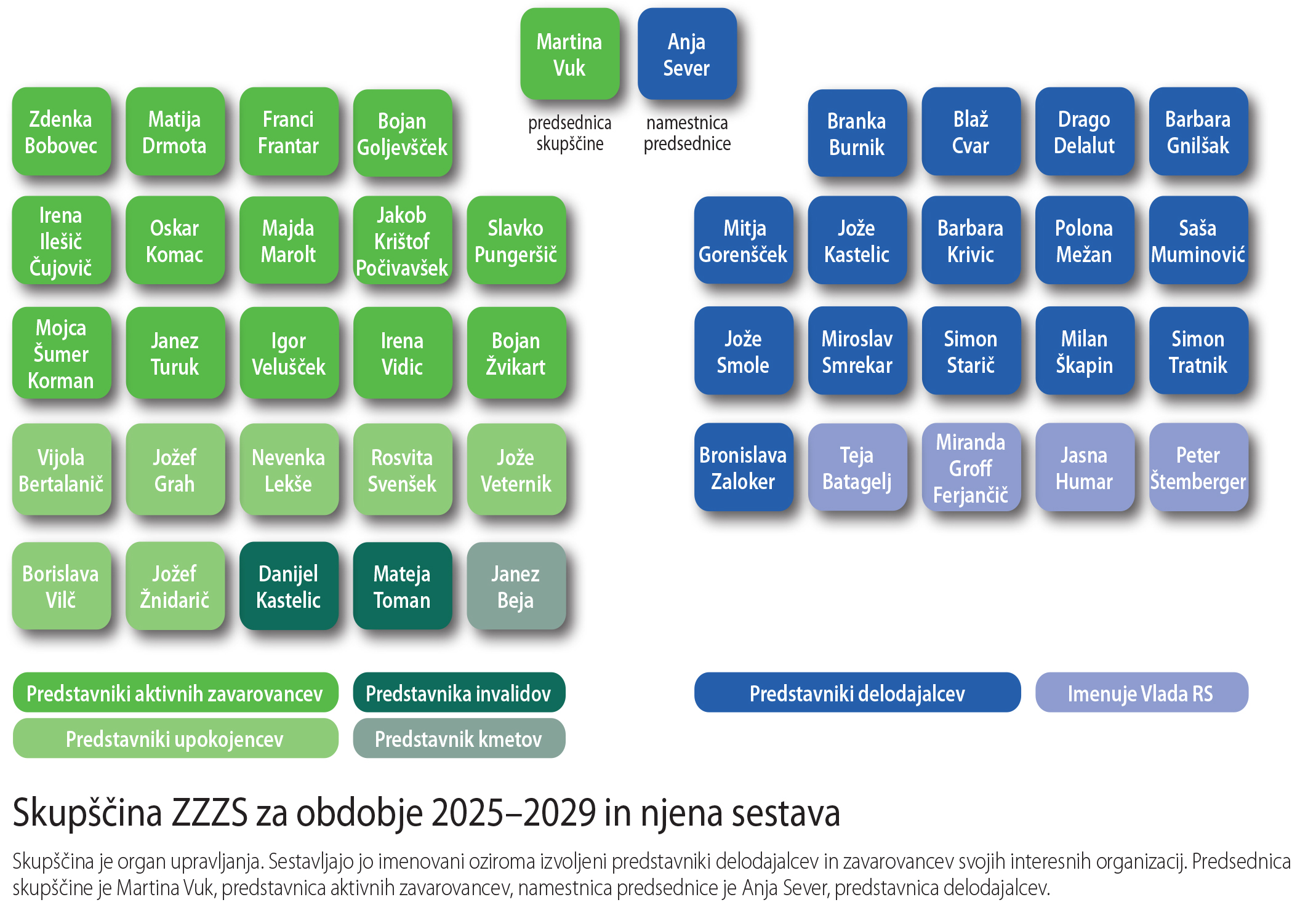 ZZZS upravlja skupščina, ki jo sestavljajo demokratično izvoljeni predstavniki delodajalcev in zavarovancev kot interesnih skupin plačnikov prispevkov za obvezno zdravstveno zavarovanje. Ima 45 članov. Ključne naloge skupščine so: